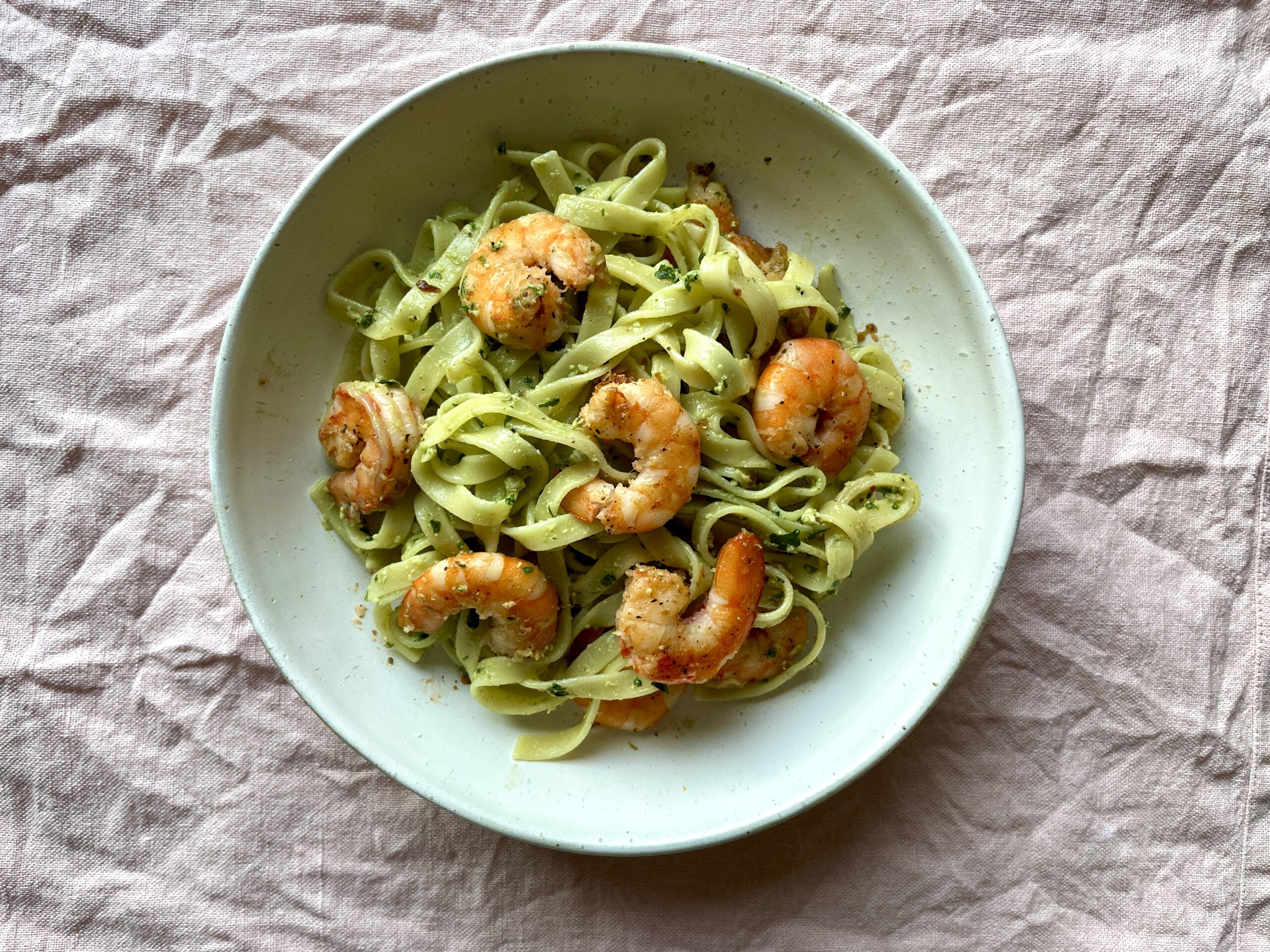 For the pasta, I personally love tagliatelle or fettuccine – something about them just makes this dish feel even more summery. They work beautifully with pesto, pair perfectly with prawns, and have that special touch. But linguine (a seafood classic), spaghetti (which work with anything, don’t they?), trofie (a traditional pesto pasta that holds the sauce well), and fusilli (normal or giant) are all excellent too. It’s mostly a matter of preference, so use your favorite shape or whatever you have on hand.