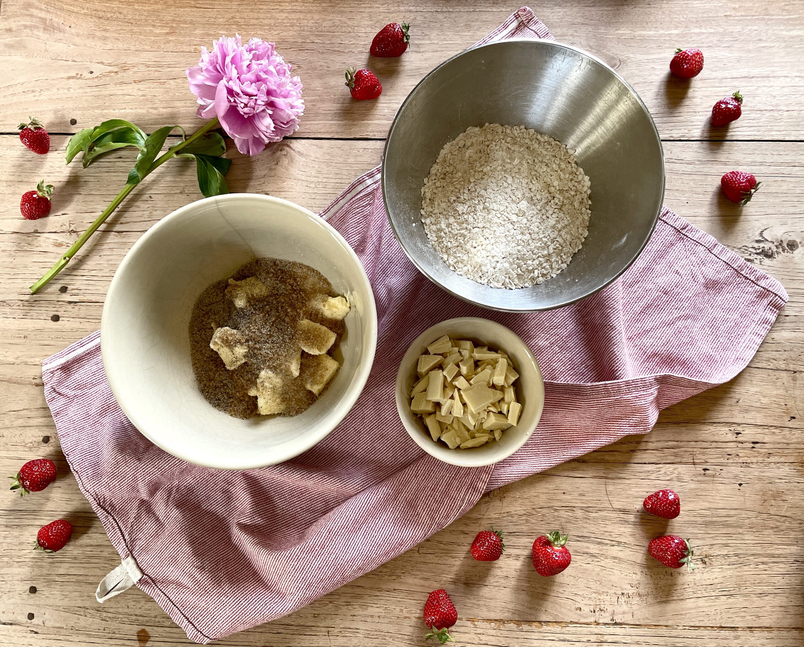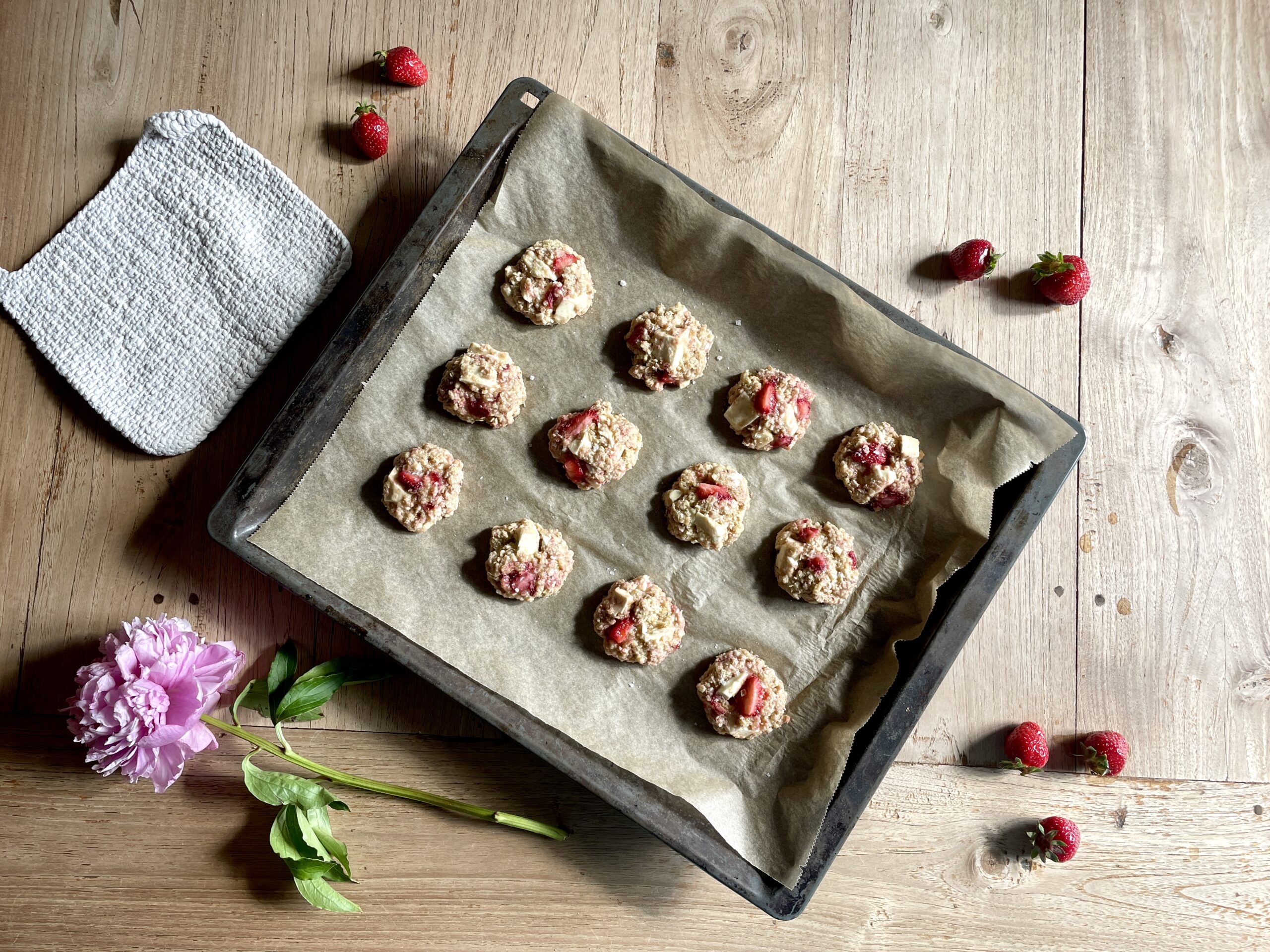 About the strawberries: I know many recipes use freeze-dried strawberries, but I prefer fresh ones for three reasons. First, freeze-dried strawberries are very intense, and while that’s definitely a plus for many recipes, they would simply be too overwhelming here if used in the same amount. Second, fresh strawberries have this beautiful slightly sour taste that’s just right for this cookie – it’s not too much and it works wonders in combination with the white chocolate to prevent the cookies from becoming overly sweet or monotone in taste. Third, they make the oat cookies moist and make every single bite taste so fresh and just like summer! And also – why wouldn’t you want to use fresh strawberries when it’s strawberry season?