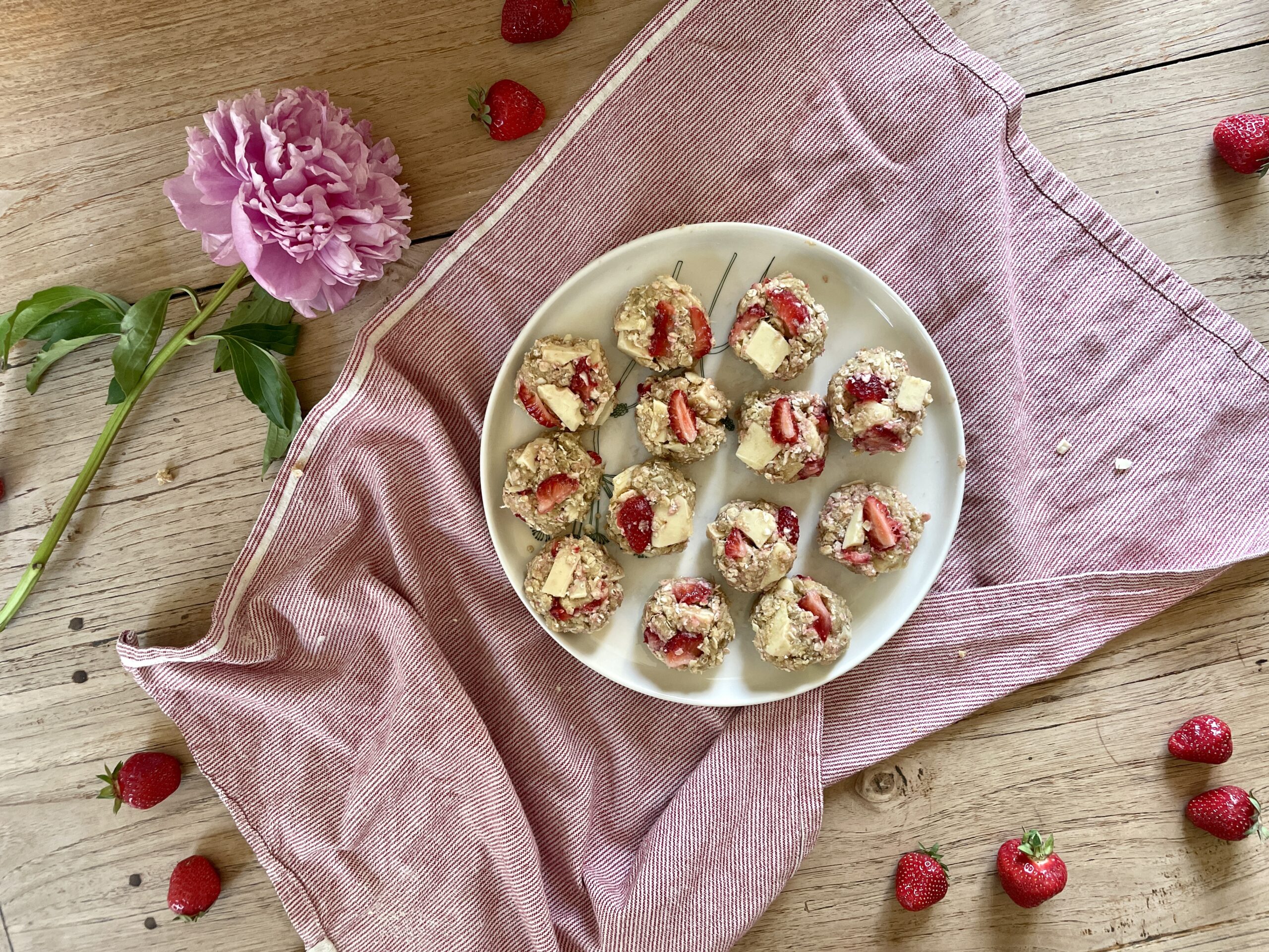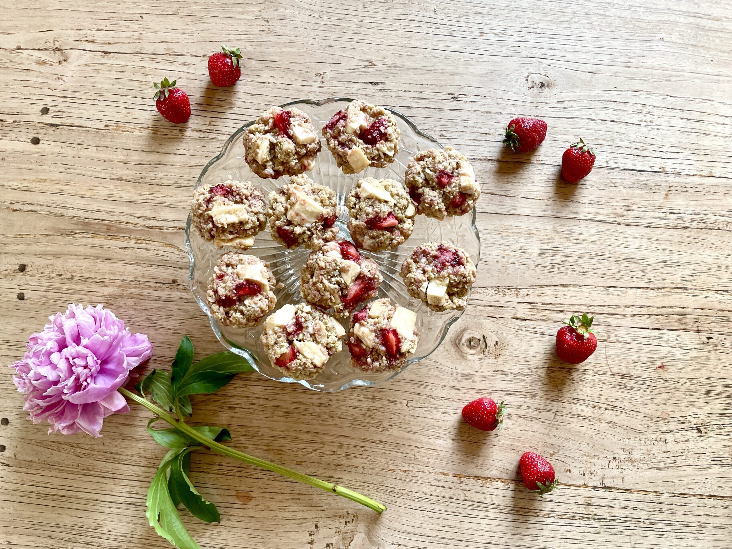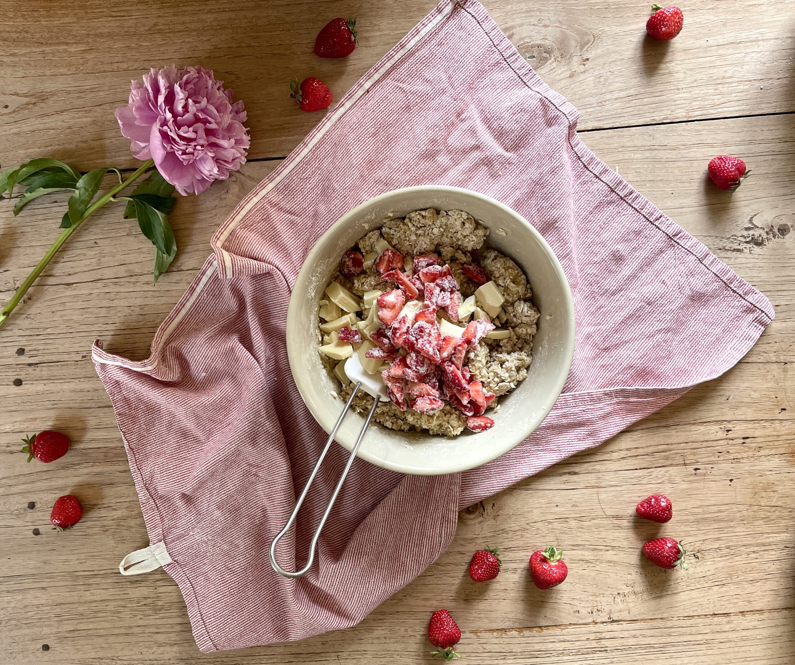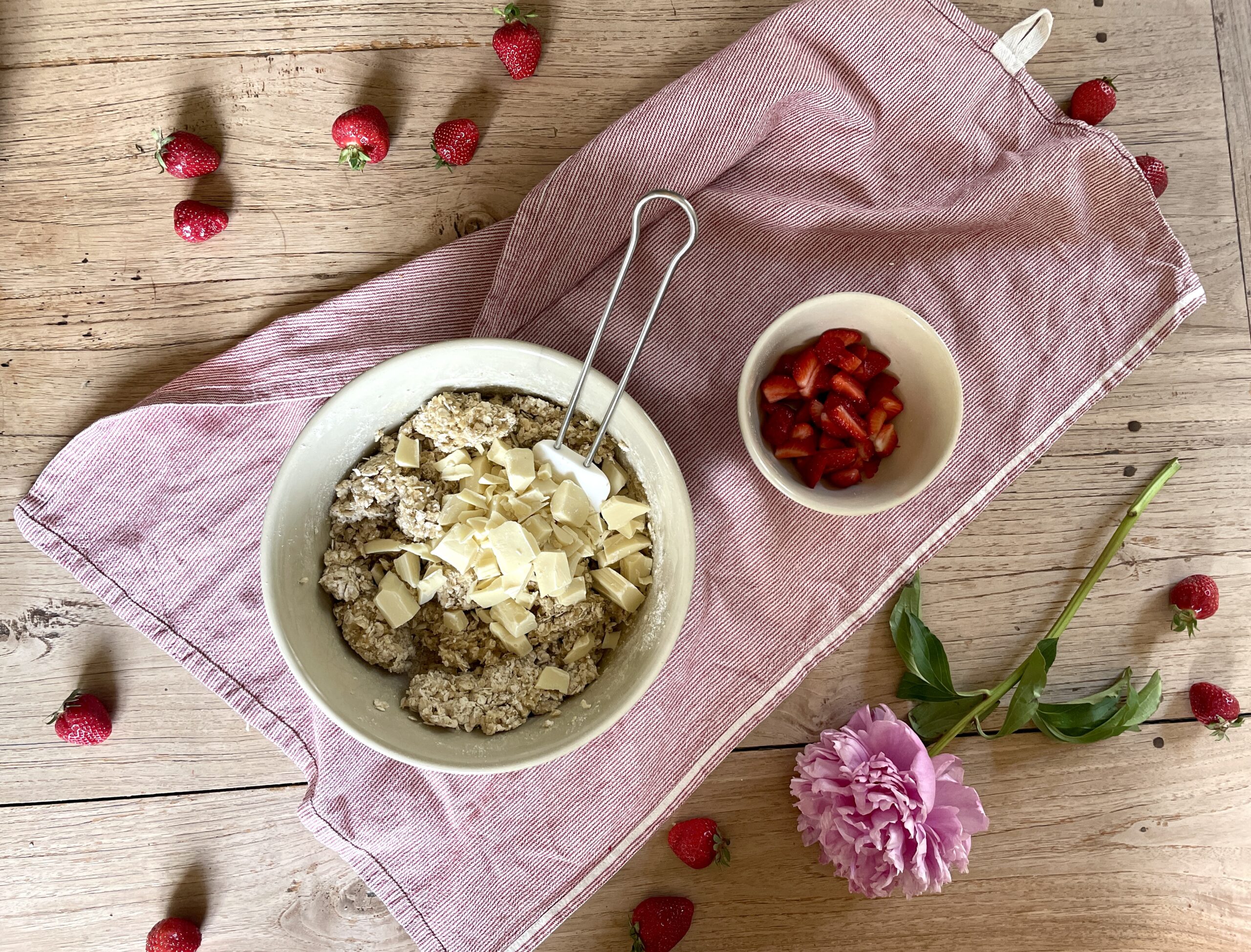 The first time I made them was soon after Mother’s Day. Living in another city than my parents, I’m not always home for this day. So when I was dog-and-cat-sitting for my family one or two weeks later, I found this to be the perfect opportunity to bake my mom a sweet gift while I was looking after the pets (she loves sweet things just as much as I do, if not more) – and, of course, make enough for the whole family. And since I found beautiful strawberries on the farmer’s market and red is the color of love, I quickly decided to go with the delightful combination of fresh strawberries and sweet white chocolate. And let me tell you – I’m so glad I did!